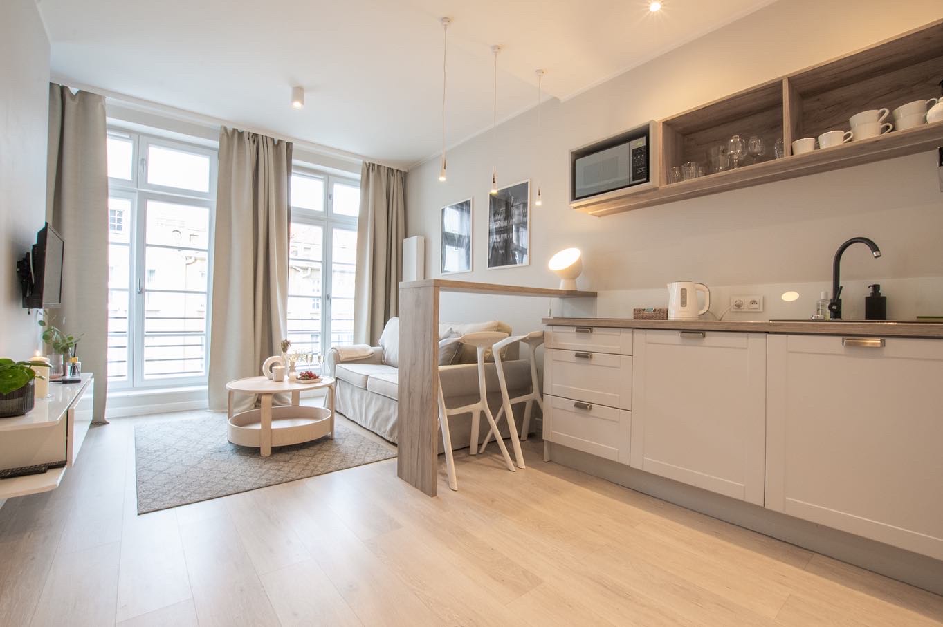 Część sypialniana z łożem 160 x 200, rozkładana sofa, prysznic, w pełni wyposażony aneks kuchenny, widok na zabytkowe kamienice.